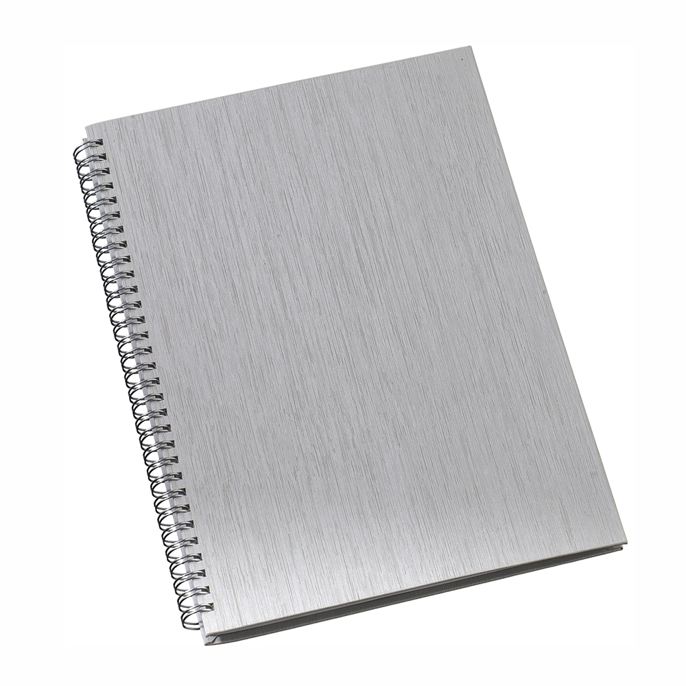 Caderno de Negócios com 100 folhas, 2×2 cores, Índice telefônico, Planejamento para próximo ano. Capa metalizada prata.