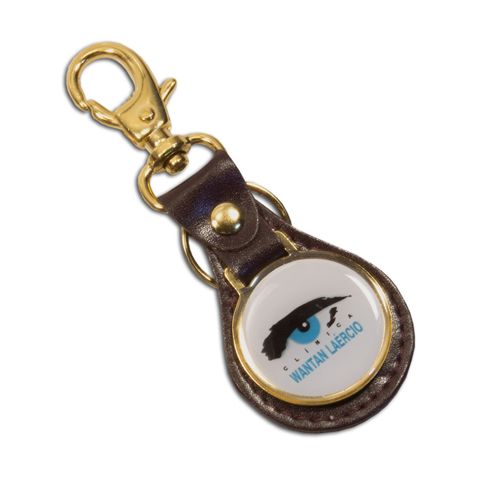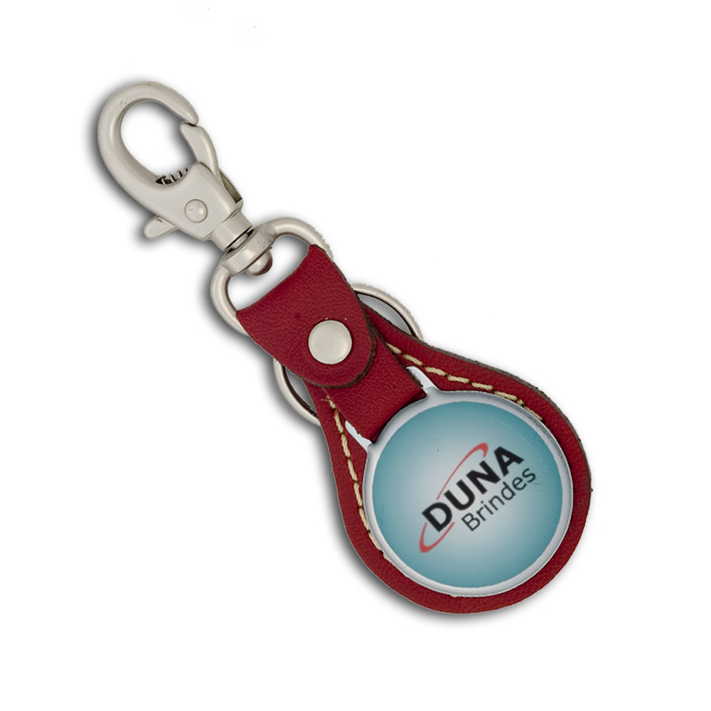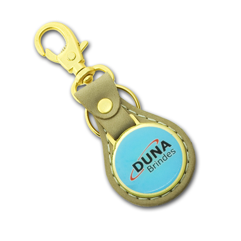 Chaveiro redondo com base de couro legítimo, plaqueta em metal dourado ou niquelado com impressão digital resinada, argola e mosquetão.
