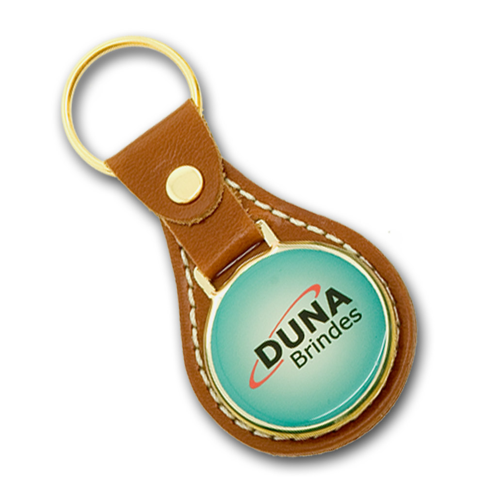 Chaveiro redondo com base de couro legítimo, plaqueta em metal dourado ou niquelado com impressão digital resinada e argola.
