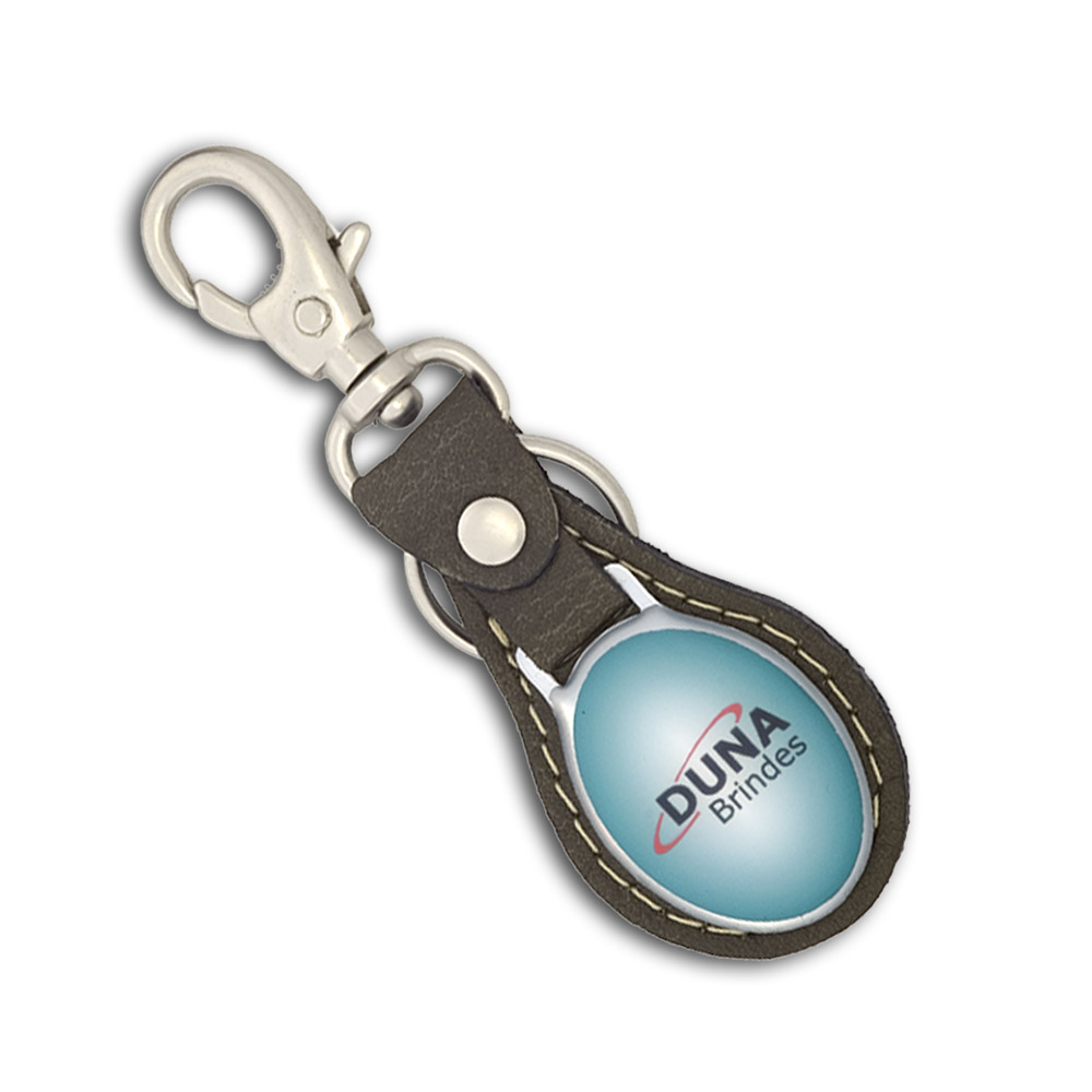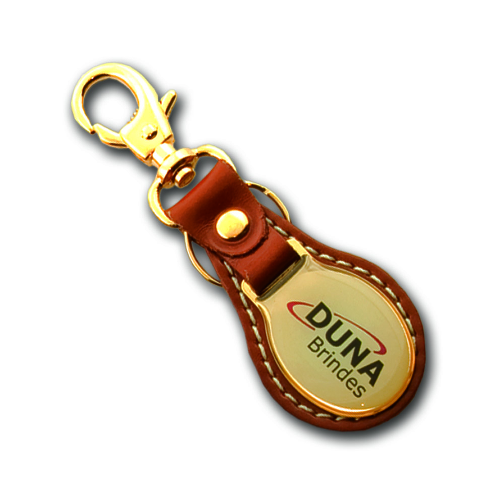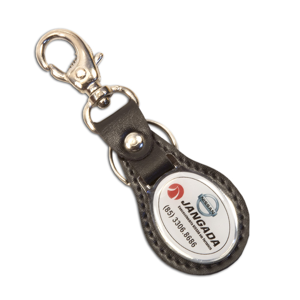 Chaveiro oval com base de couro legítimo, plaqueta em metal dourado ou niquelado com impressão digital resinada, argola e mosquetão.