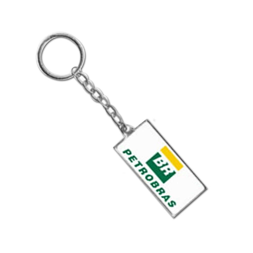 Chaveiro medalha retangular com impressão digital resinada e corrente tradicional.