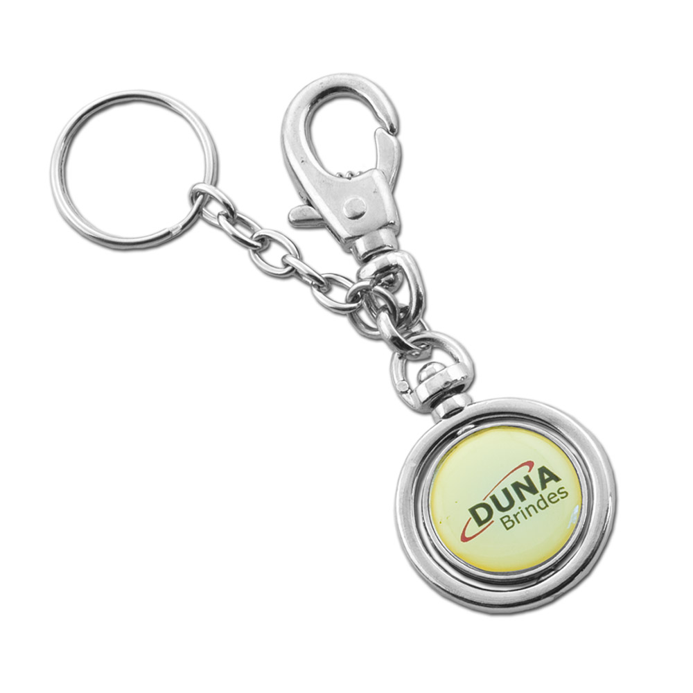 Chaveiro redondo giratório,dupla face, impressão digital resinada, corrente tradicional e mosquetão.