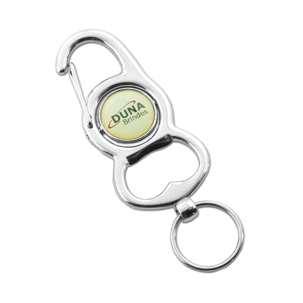 Chaveiro anzol Abridor de garrafa, giratório, dupla face com impressão digital resinada.