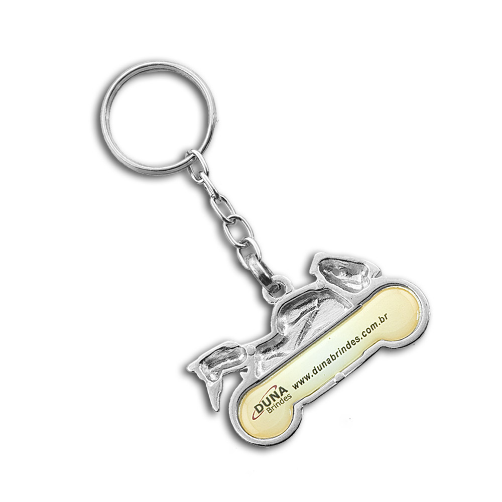Chaveiro recortado, com impressão digital resinada e corrente tradicional.