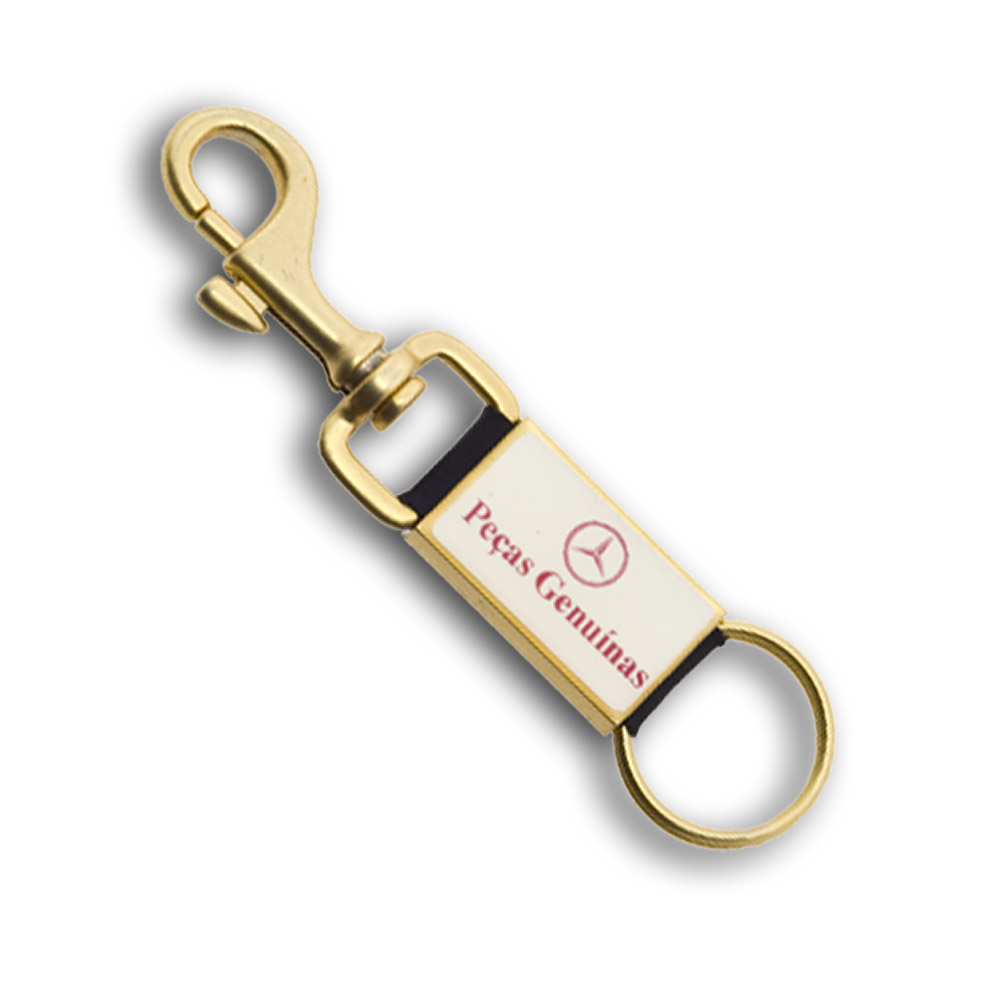 Chaveiro em metal tubo dourado ou niquelado com impressão digital resinada, mosquetão giratório e argola.