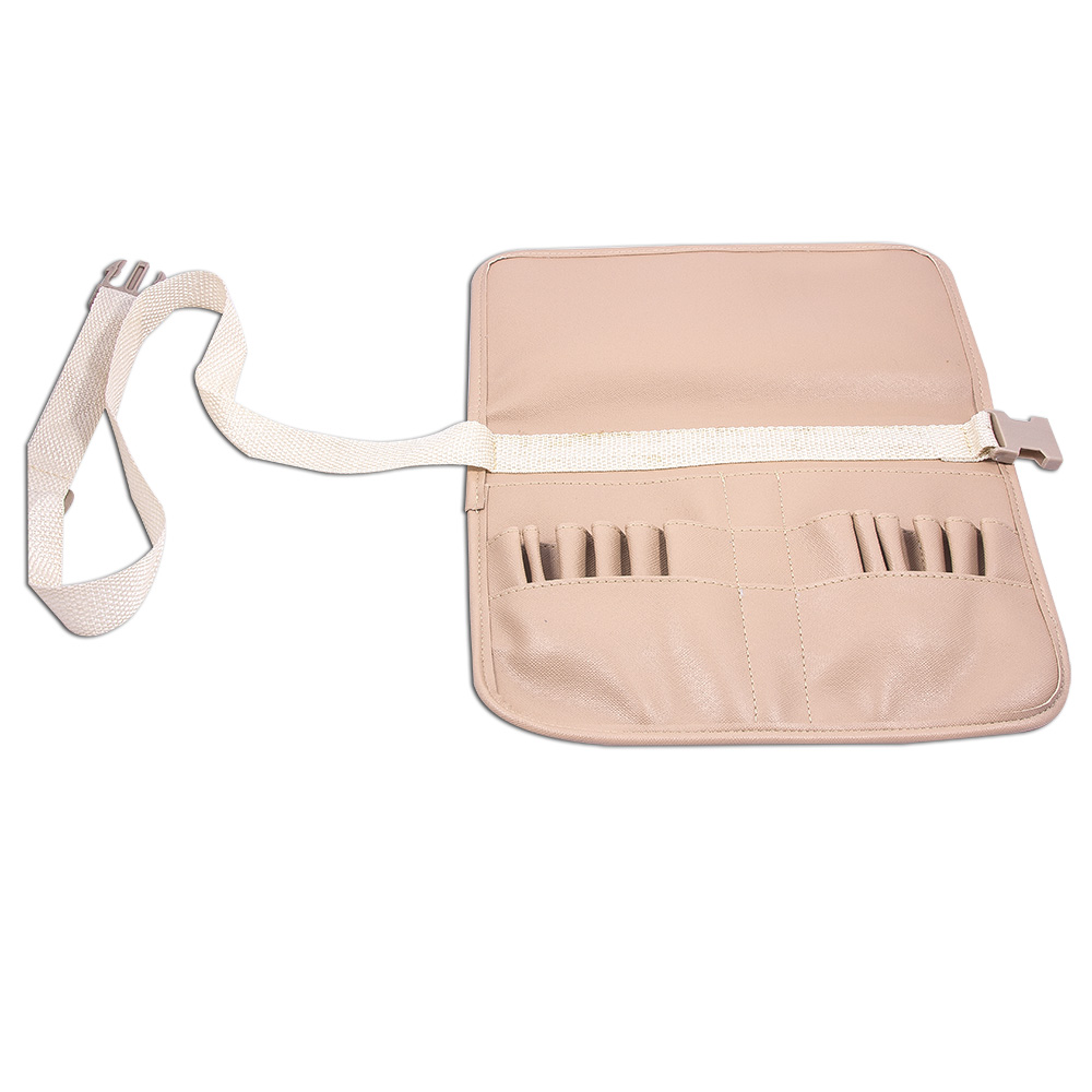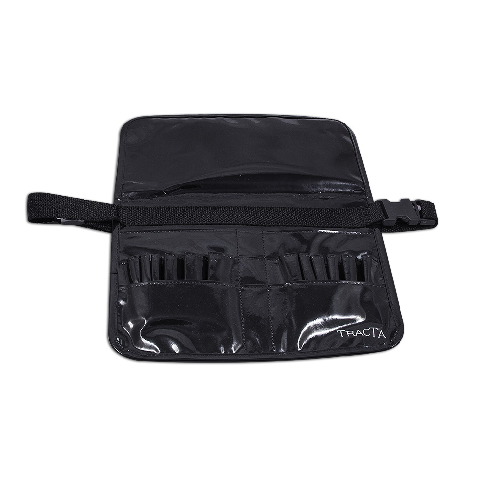 Estojo profissional porta pincéis com cinto regulador contendo uma fita 30 mm com reforço em recouro com uma gravação em silk em uma cor. Cinturão Pinceis Tracta.