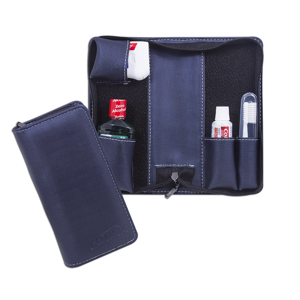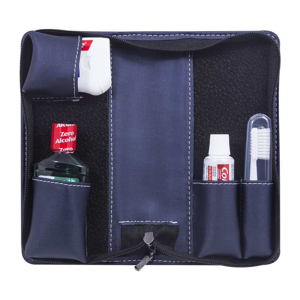 Kit Bucal, estojo com fechamento em ziper, fio dental caixinha, enxaguante bucal, com creme dental e escova de dentes. Personalizado em baixo relevo com sua logomarca.