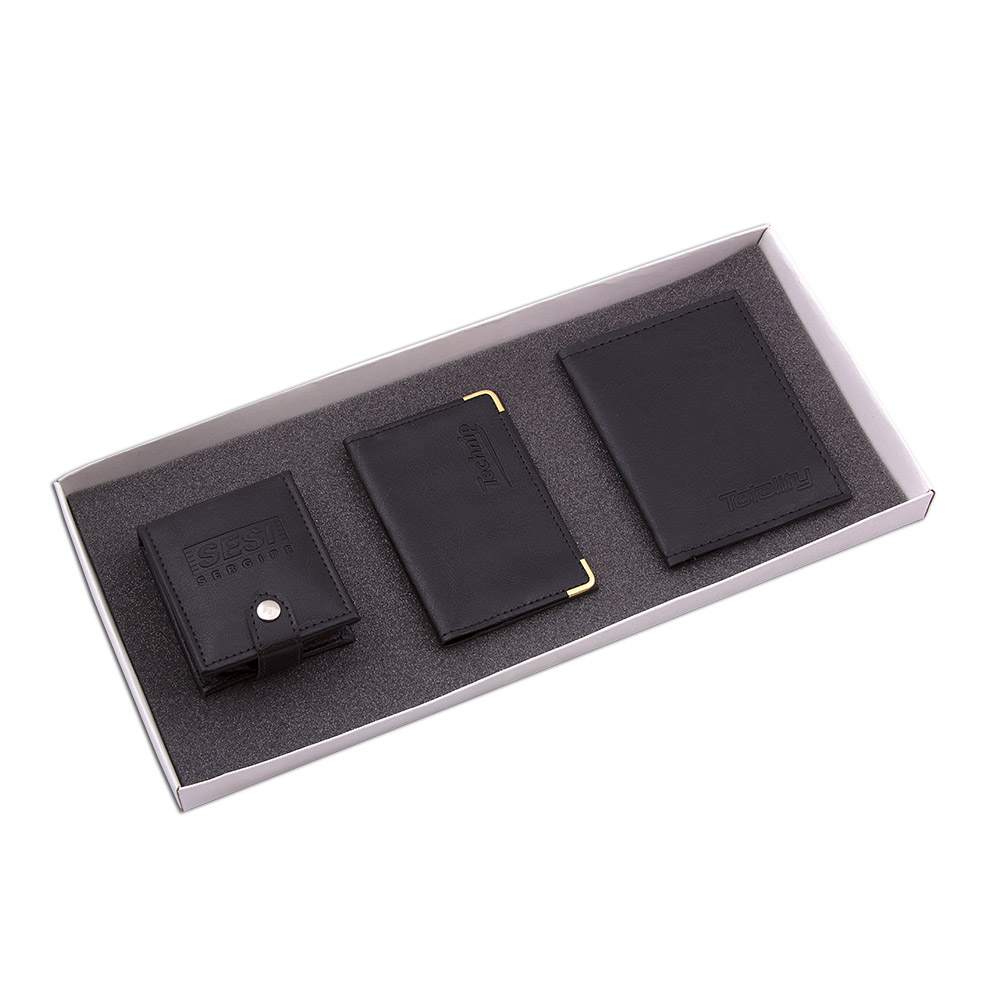 Kit contendo um porta cartão (Ref. PC 1702), um porta batom duplo (Ref. PT 1901) e um porta documento (Ref. PD 2001) acomodados em uma caixa de papelão.