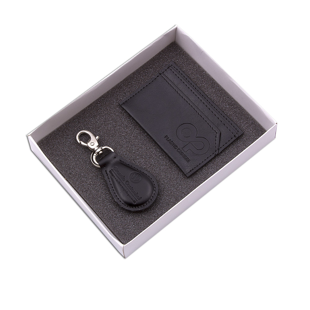 Kit contendo um porta cartão (ref. PC 1701) e um chaveiro (ref. CC 451) acomodados em uma caixa de papelão. Kit Personalizado com sua logomarca.