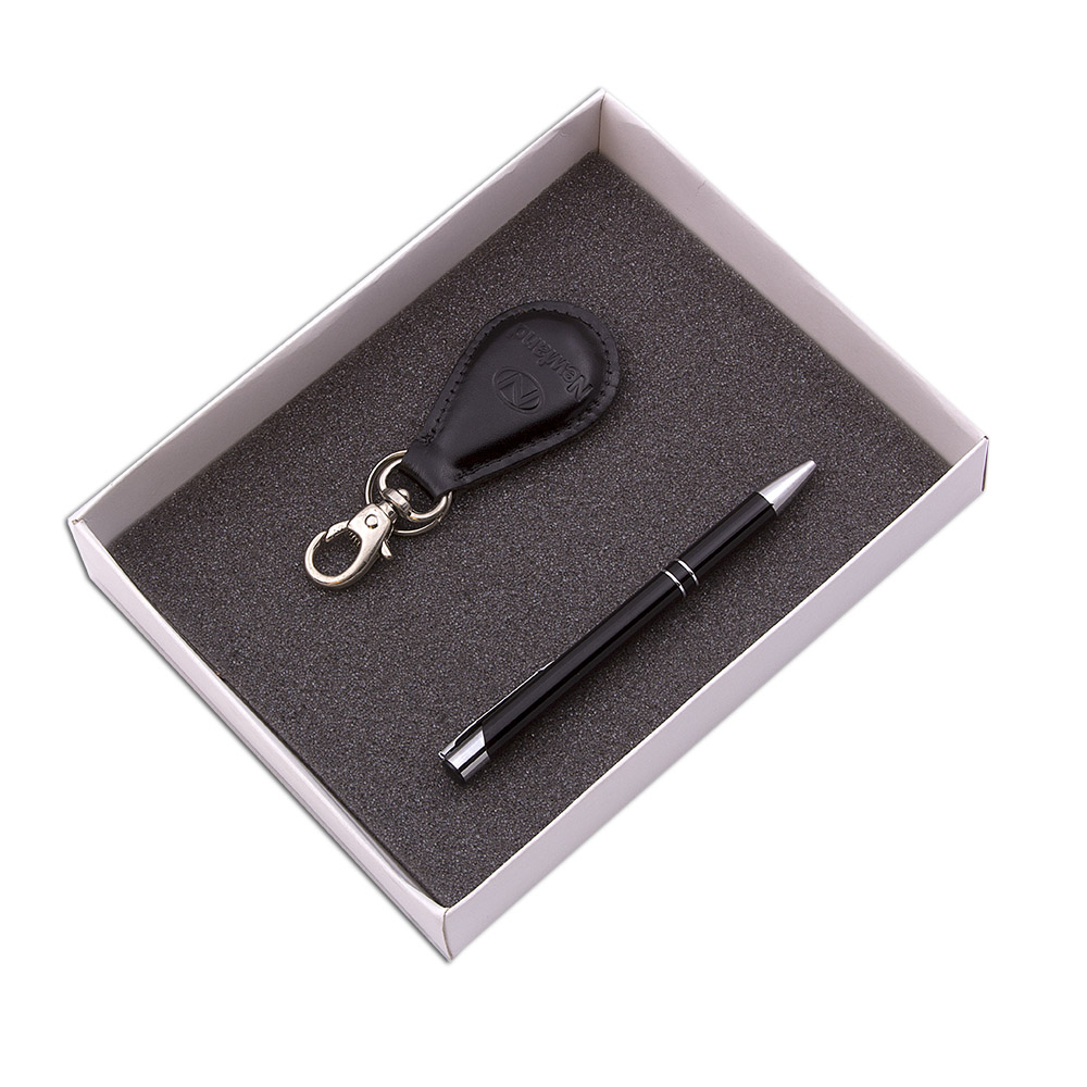 Kit contendo uma caneta em metal (ref. CNT 1005) e um chaveiro bari com mosquetão (ref. CC 451) acomodados em uma caixa de papelão.