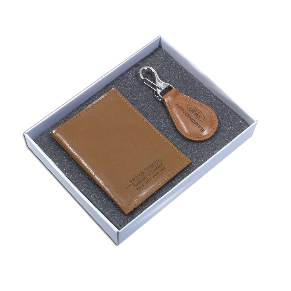 Kit contendo um porta documento veicular (ref. PD 2006) e um chaveiro (ref. CC 450) acomodados em uma caixa de papelão. Kit Personalizado com sua logomarca.