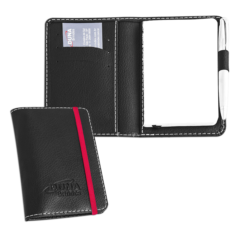 Moleskine contendo bloco para anotações de 50 folhas com refil, duas divisórias para cartões e duas abas para papéis. Personalizado em baixo relevo.