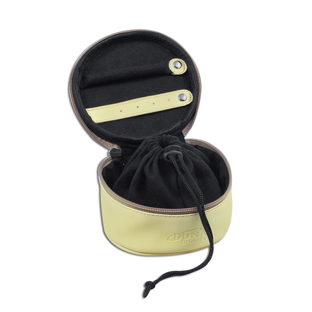 Porta Joias confeccionado em sintético com uma tira para brincos e outra para anéis. Saquinho de forro fixado à base e com fechamento por cordão.
