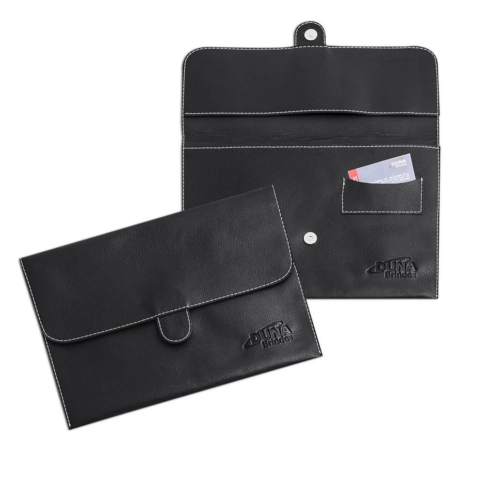 Pasta de convenção confeccionada em couro legítimo, couro sintético ou couro ecológico (Recouro), fechamento por botão magnético e personalização em baixo relevo.
