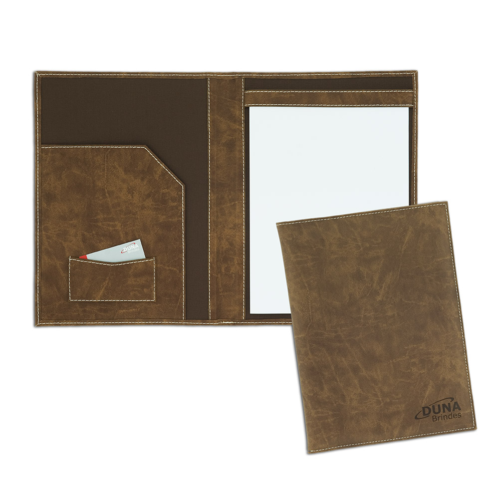 Pasta Congresso confeccionada em couro legítimo, couro sintético ou couro ecológico (Recouro), com uma aba para papéis, porta cartão, porta caneta e porta bloco (A4). Pasta Congresso personazizada em baixo relevo com sua logomarca.
