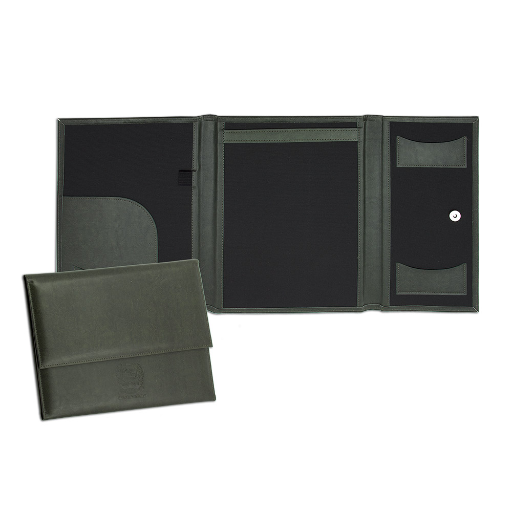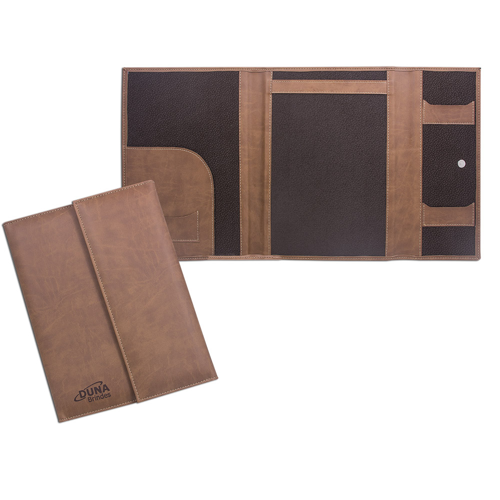 Pasta para convenção confeccionada em couro legítimo, couro sintético ou couro ecológico (Recouro), com uma aba para papéis, dois porta cartões, porta caneta e porta bloco (A4). Fechamento por botão magnético.