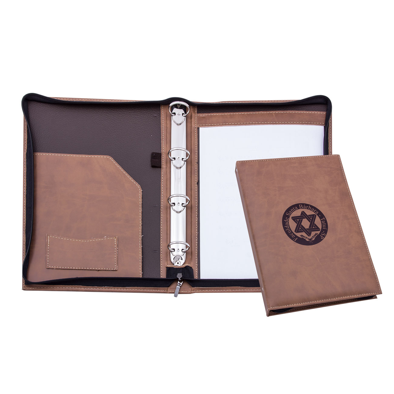 Pasta Fichário confeccionada em couro legítimo, couro sintético ou couro ecológico (Recouro), com ferragem de 4 argolas para fichário, fechamento em zíper e aba para encaixe de papéis (A4). Pasta personalizada em baixo relevo com sua logomarca.