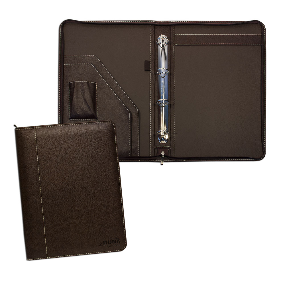Pasta Fichário confeccionada em couro legítimo, couro sintético ou couro ecológico (Recouro), com duas abas para encaixe de papéis, porta bloco (A4), porta cartão, porta calculadora e ferragem para fichário 4 argolas. Fechamento por zipper. Pasta fichário personalizada em baixo relevo.