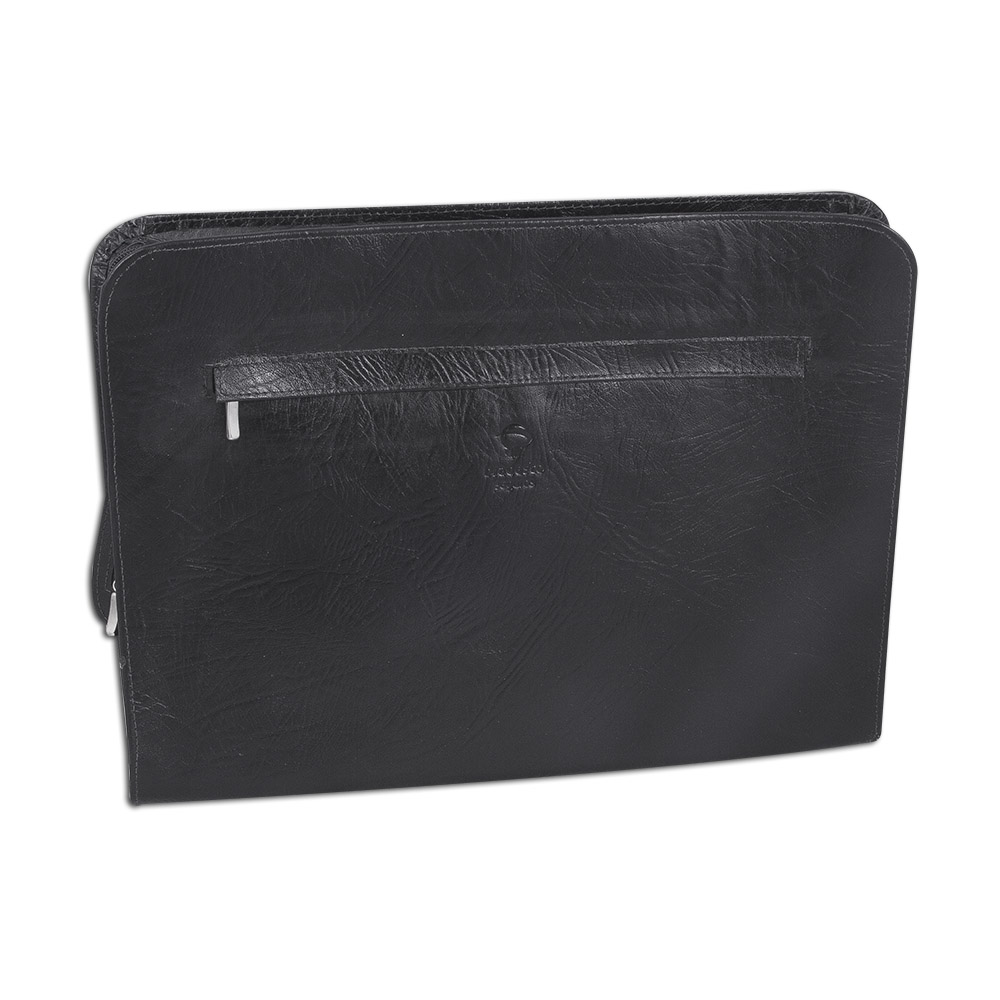 Pasta para convenção com fechamento por zíper, uma bolsa interna, uma divisória para cartão, porta caneta, porta bloco (A4) e bolso externo.
