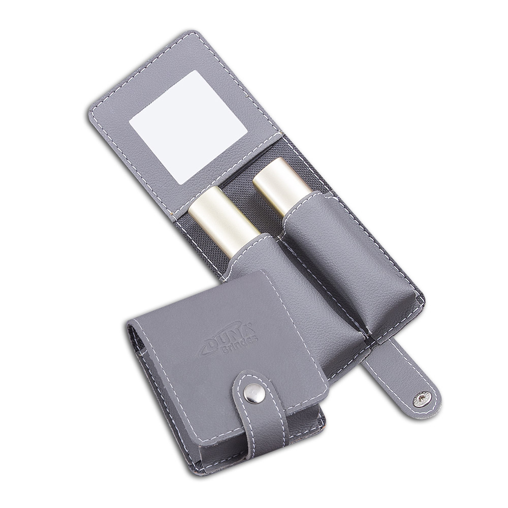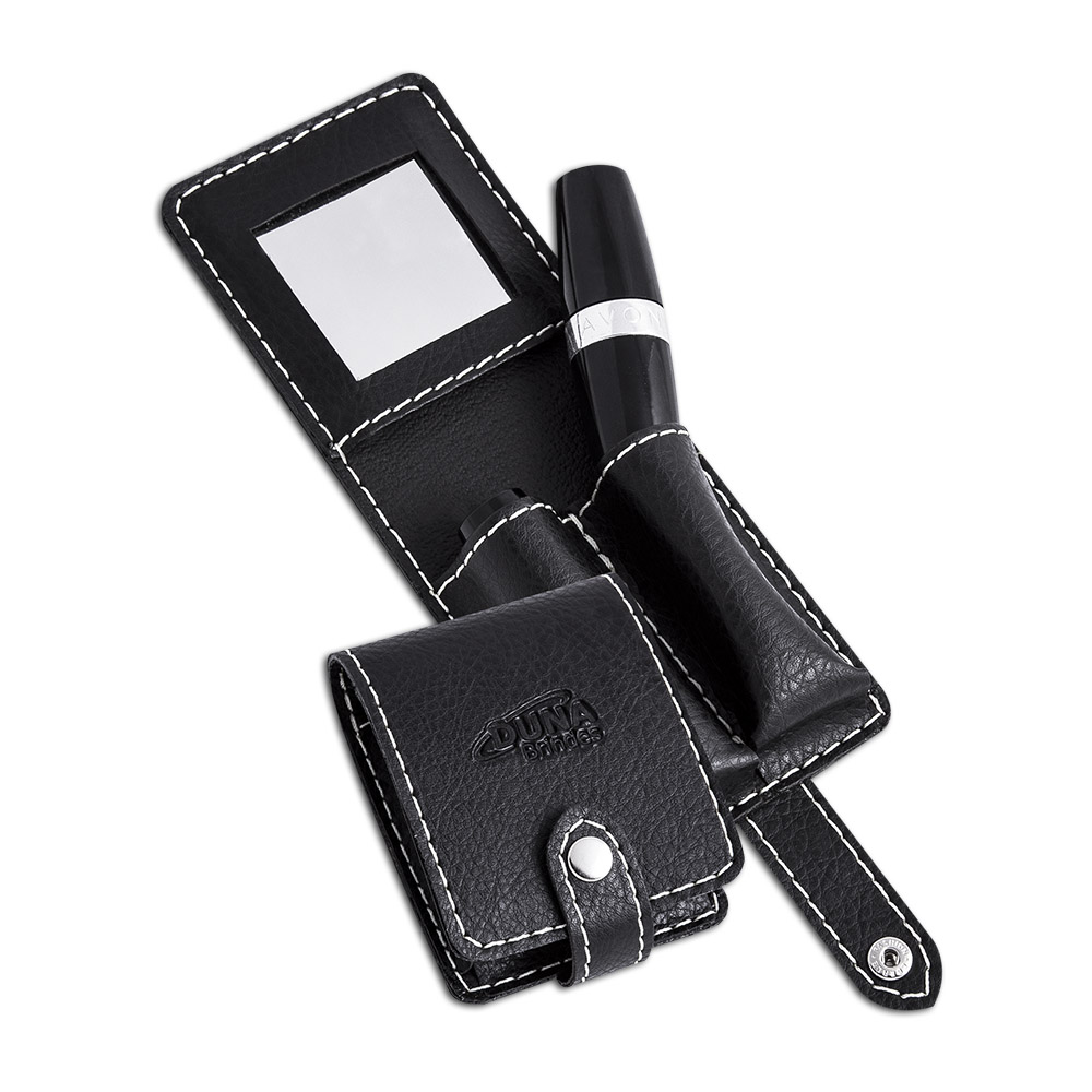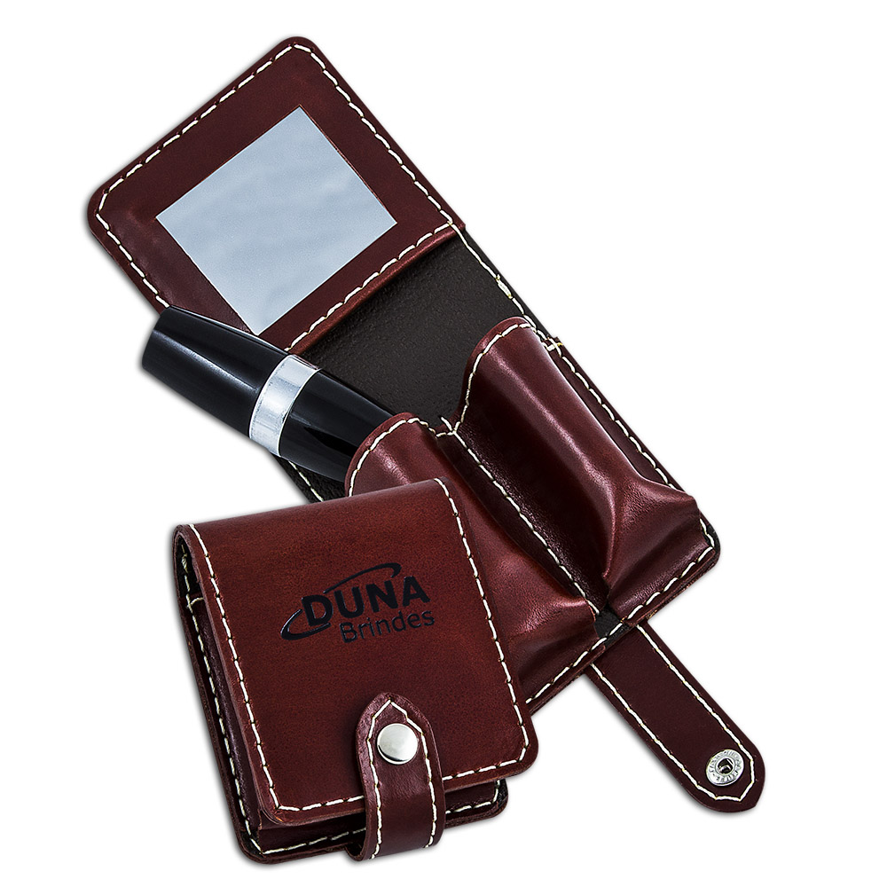 Porta batom confeccionado em couro legítimo, couro sintético ou couro ecológico (Recouro), com espelho e suporte para dois batons. Personalizado em baixo relevo.