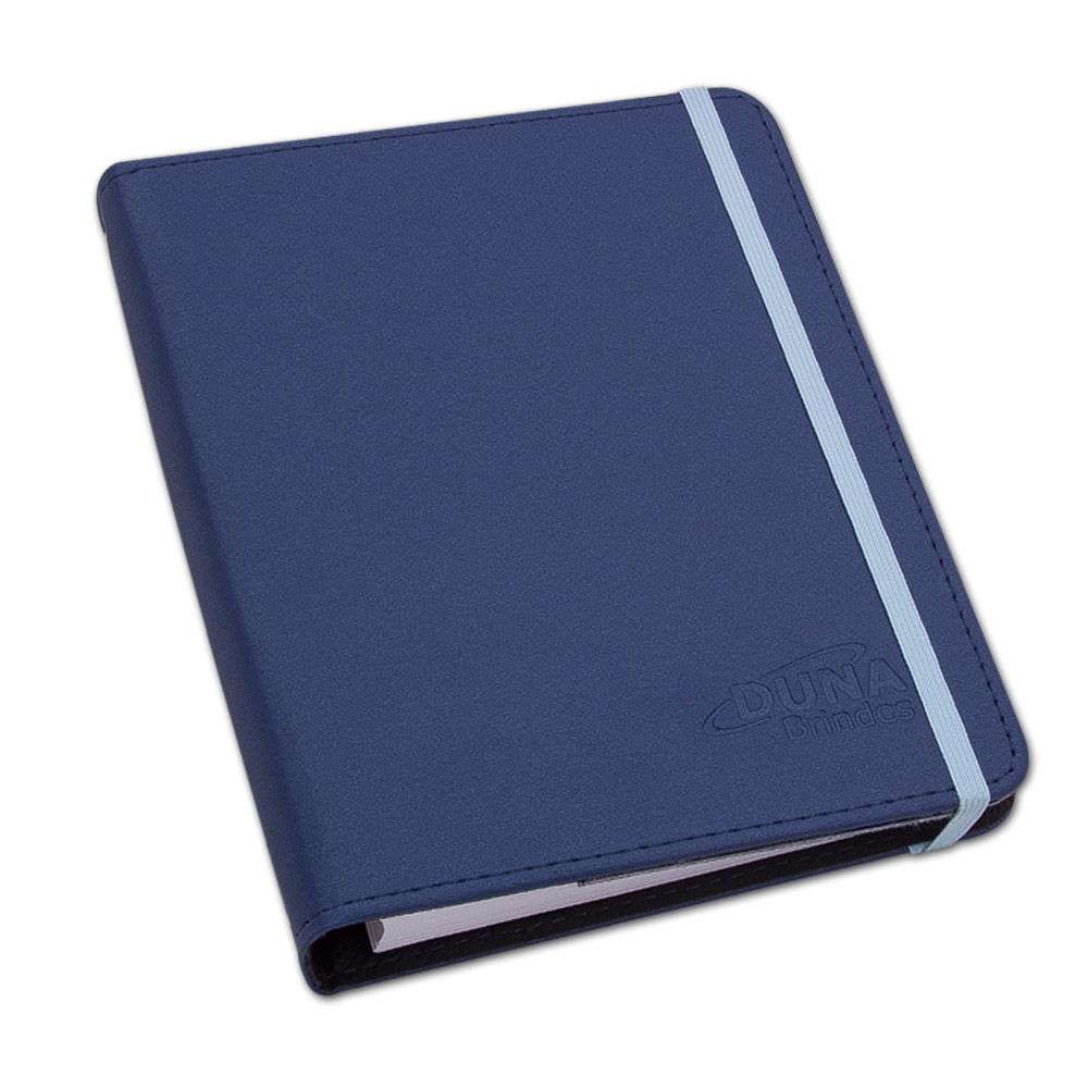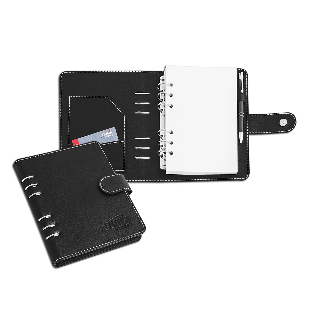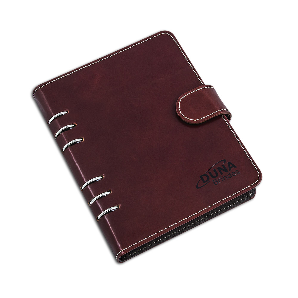 Porta Bloco confeccionado em couro legítimo, couro sintético ou couro ecológico (Recouro), com ferragem seis argolas, porta caneta, aba para encaixe de papéis e porta cartões. Porta Blocos personalizado em baixo relevo.