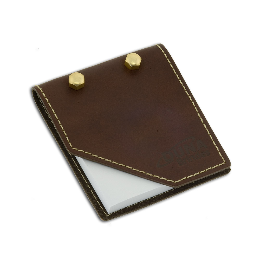 Porta Bloco com parafusos sextavados confeccionado em couro legítimo, couro sintético ou couro ecológico (Recouro). Bloco de anotações medindo 9 x 8 cm com 100 folhas. Porta Bloco de anotações personalizado em baixo relevo.