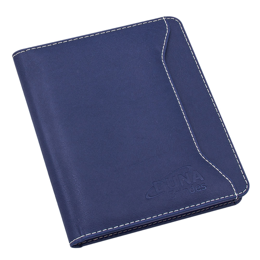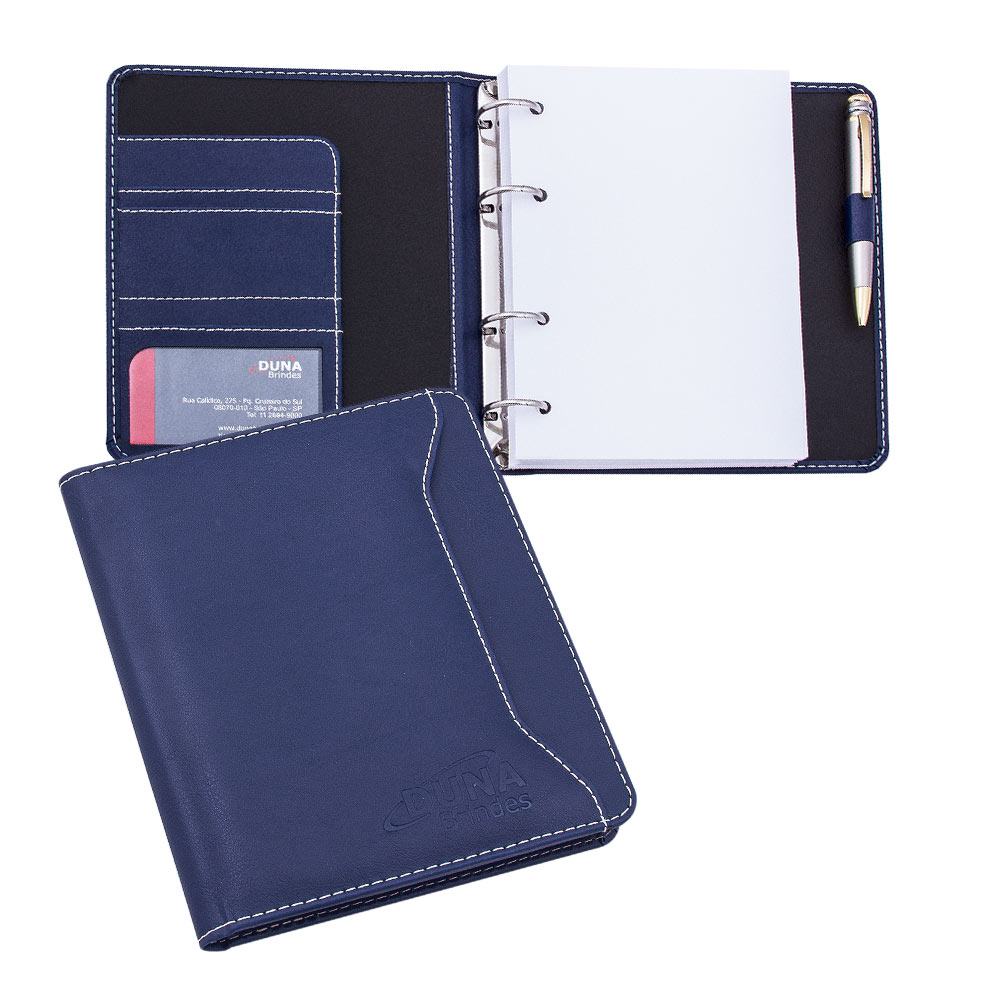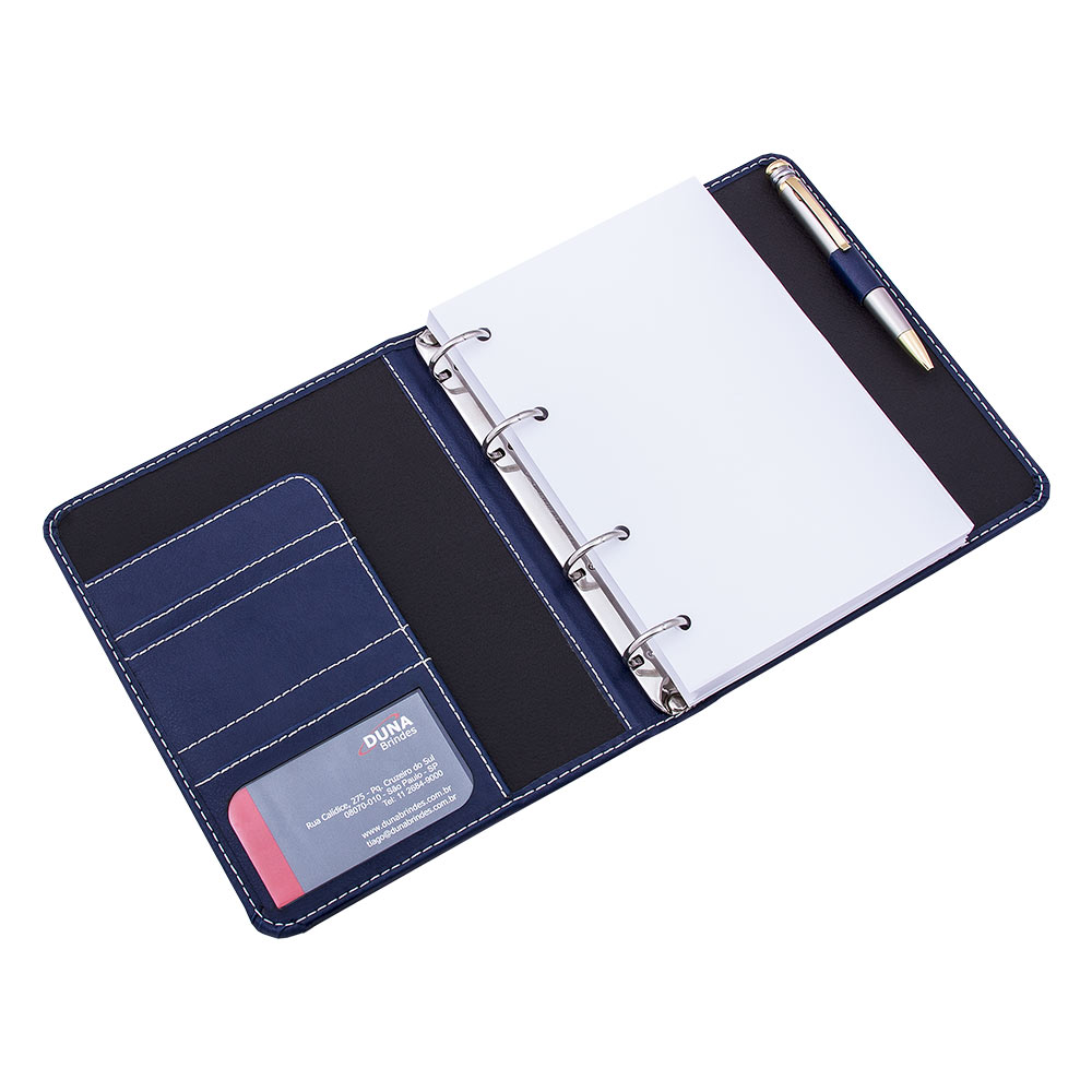 Porta Bloco de anotações com ferragem 4 argolas, aba com recorte na capa, porta caneta, três porta cartões, aba interna para encaixe de papéis, e bloco de anotações medindo 15 x 20 cm com 150 folhas.