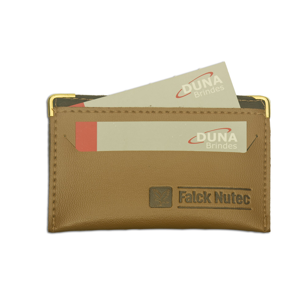 Porta Cartões com duas divisórias confeccionado em couro legítimo, couro sintético ou couro ecológico (Recouro) com uma gravação em baixo relevo de sua logomarca.