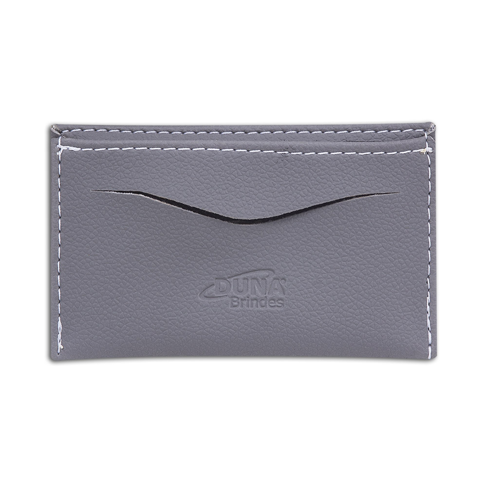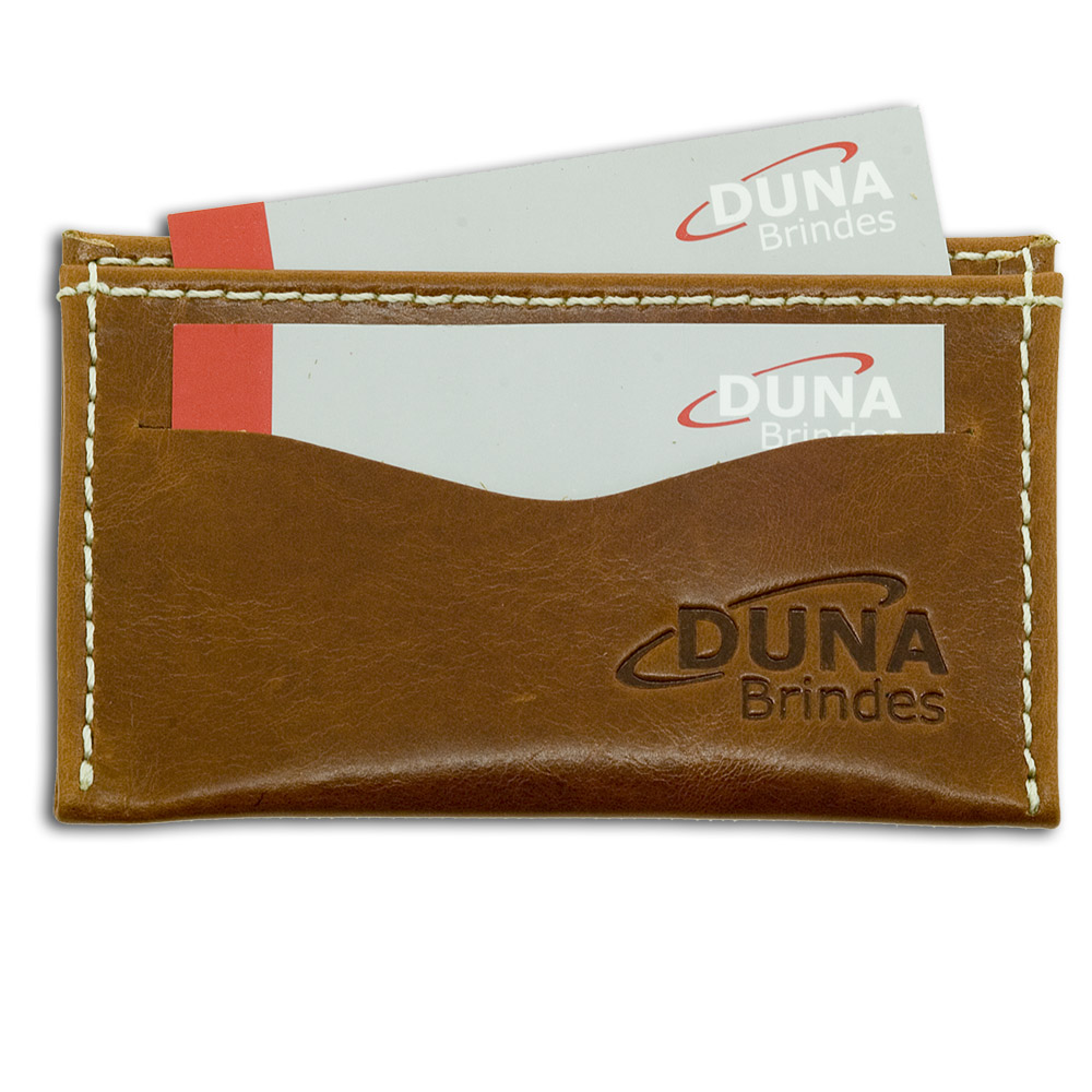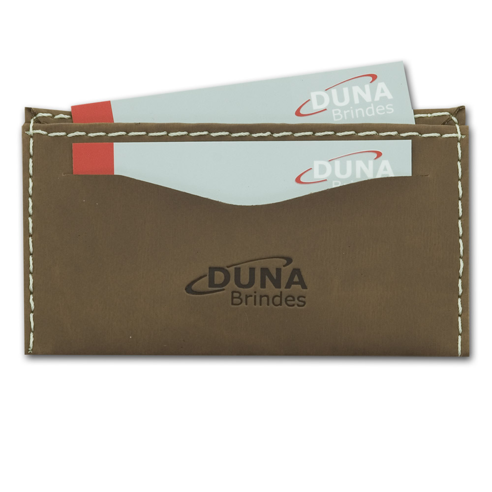 Porta cartão com duas divisórias confeccionado em couro legítimo, couro sintético ou couro ecológico (Recouro) com uma gravação em baixo relevo da sua logomarca.