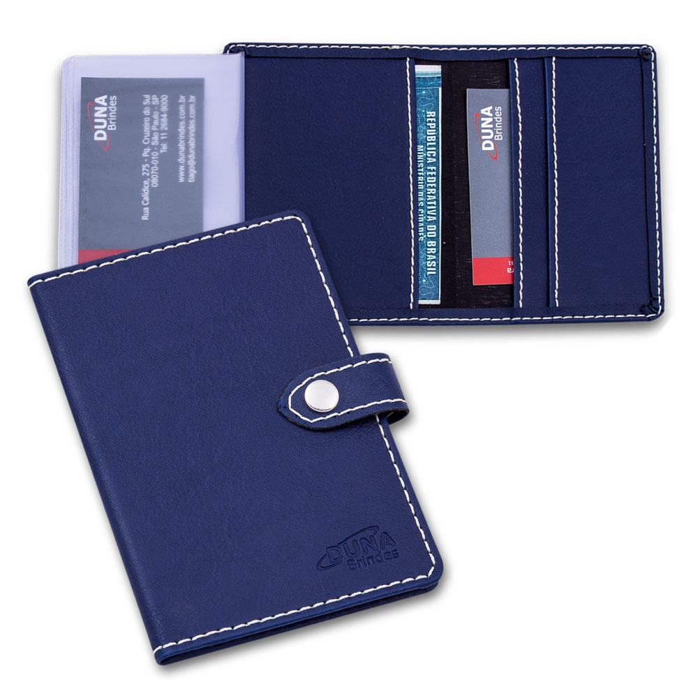 Porta Documento com dois compartimentos para cartões, um bolso para porta documento e divisórias em pvc. Fechamento por botão de pressão.