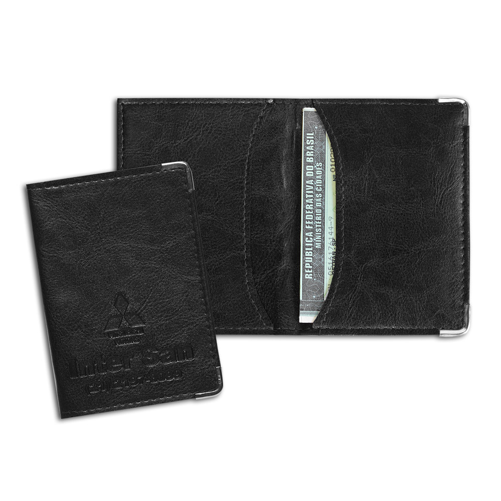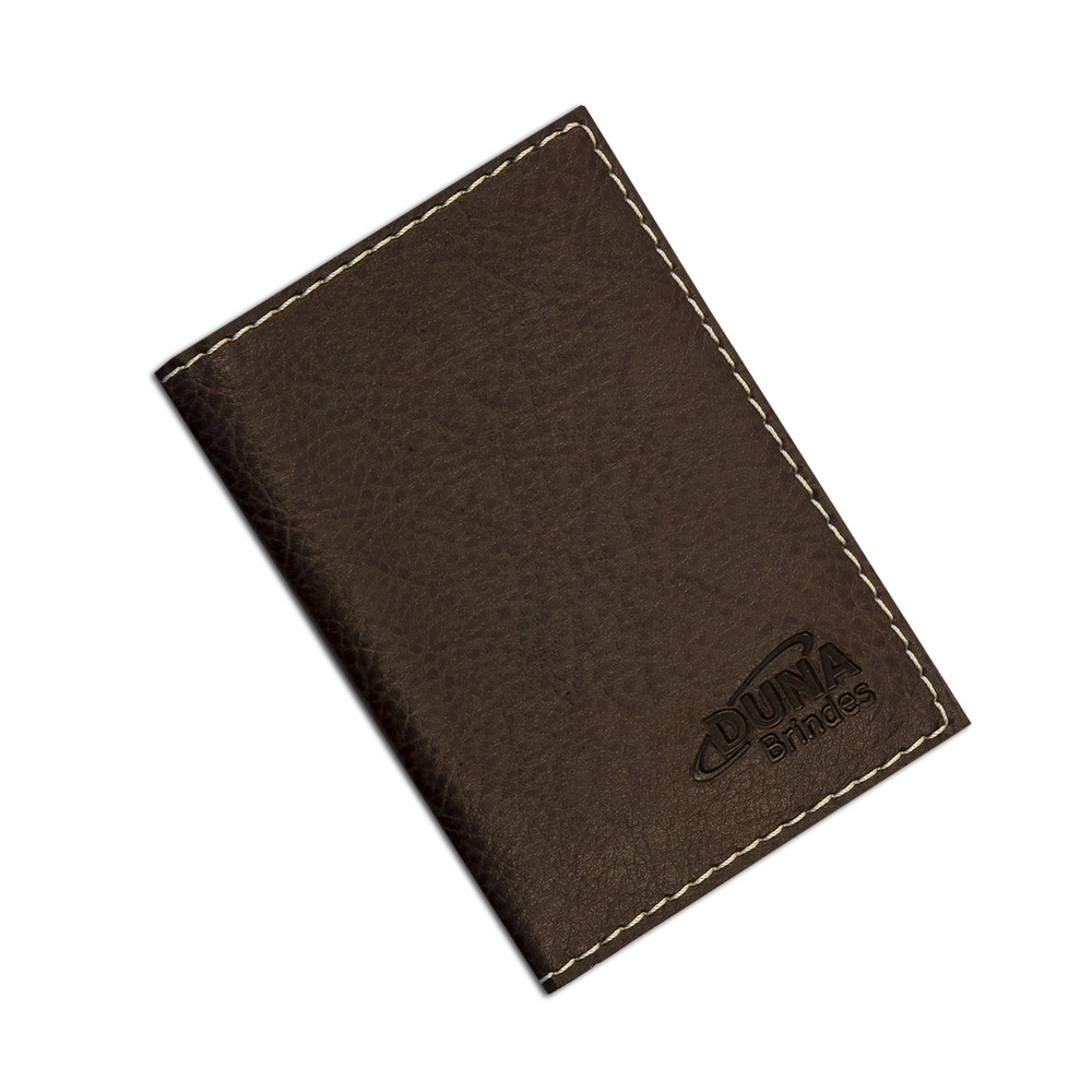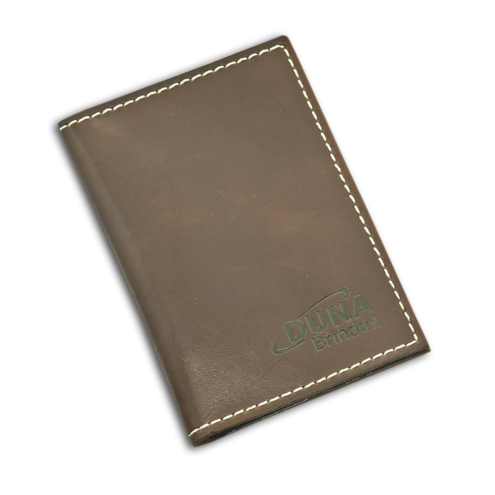 Porta Documentos em couro legítimo, couro sintético ou couro ecológico (Recouro) com gravação em baixo relevo ou silk screen.